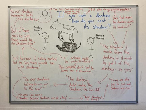 Tom:I absolutely loved making the session that asks “If you hire a donkey, do you hire its shadow?” inspired by the famous Aesop’s fable. This question jumped out at me when I was revisiting the book of fables I was given when I was five. The story of an argument in the midday sun between the owner of a donkey, and someone hiring it, has a beautiful simplicity and the question never fails to divide a class – as this photo from Andy Westproves!
